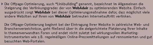 Unter dem Begriff "Offpage-Optimierung" fasst WebAdair wirkungsvolle Methoden zur Verbesserung und Optimierung Ihrer Internetseiten "von außen" zusammen. Bedeutet: Den Erfolg Ihrer Website bestimmt WebAdair nicht direkt auf der für Sie erzeugten Website, sondern durch geschicktes Networking und in Zusammenarbeit mit thematisch ähnlich gelagerten Websites im Internet.