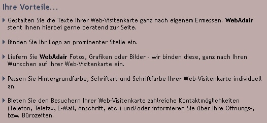 WebAdair bietet Ihnen die Web-Visitenkarte zum absoluten Knallerpreis von pauschal nur EUR 99.-** an. Domainregistrierung inklusive*. Nach einer ausführlichen Beratung erstellt WebAdair, basierend auf den von Ihnen angelieferten Texten, Bildern und Logos Ihre Web-Visitenkarte. Individuell, persönlich, professionell und stets erweiterbar durch die WebAdair-Paketlösungen. Somit versetzt WebAdair auch Sie-, vielleicht mit einem nur beschränkten Budget ausgestattet-, in die Lage, innerhalb kürzester Zeit im Internet vertreten zu sein.