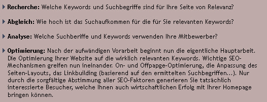 Bevor WebAdair für Sie mit der eigentlichen Suchmaschinenoptimierung starten kann, steht eine genau Konzeption hinsichtlich der wahrscheinlich von Ihrer Zielgruppe verwendeten Suchbegriffe (Keywords) an. Auf exakt diese Begriffe (Keywords) hin wird Ihre Seite von WebAdair optimiert. Dies klingt leichter als es ist, da Benutzer von Suchmaschinen nicht unbedingt jeden naheliegenden Suchbegriff verwenden.