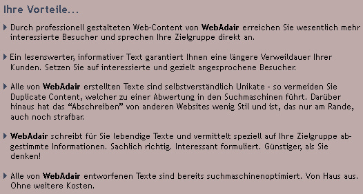 WebAdair textet den Content für Ihre Website, korrigiert oder überarbeitet bereits vorhandenen Text und übersetzt diesen, falls von Ihnen gewünscht, in die unterschiedlichsten Sprachen. Beginnend bei Artikelbeschreibungen für Ihren Onlineshop, über Blogbeiträge, bis hin zu Forenbeiträgen für Ihr Forum - WebAdair bietet Ihnen professionellen Textservice von Anfang an. Ein professioneller, auf Ihre Zielgruppe hin optimierter Textcontent bietet Ihnen entscheidende Vorteile. Lesen Sie selbst!